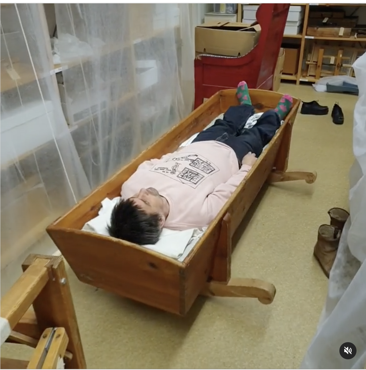 När Liveröd utforskade de psykiatriska samlingarna Säters sjukhus så stötte han på just en sådan vuxenvagga som använts för oroliga patienter. I oroliga tider så kanske denna typ av föremål kan vara behövlig även utanför sjukhusets murar.