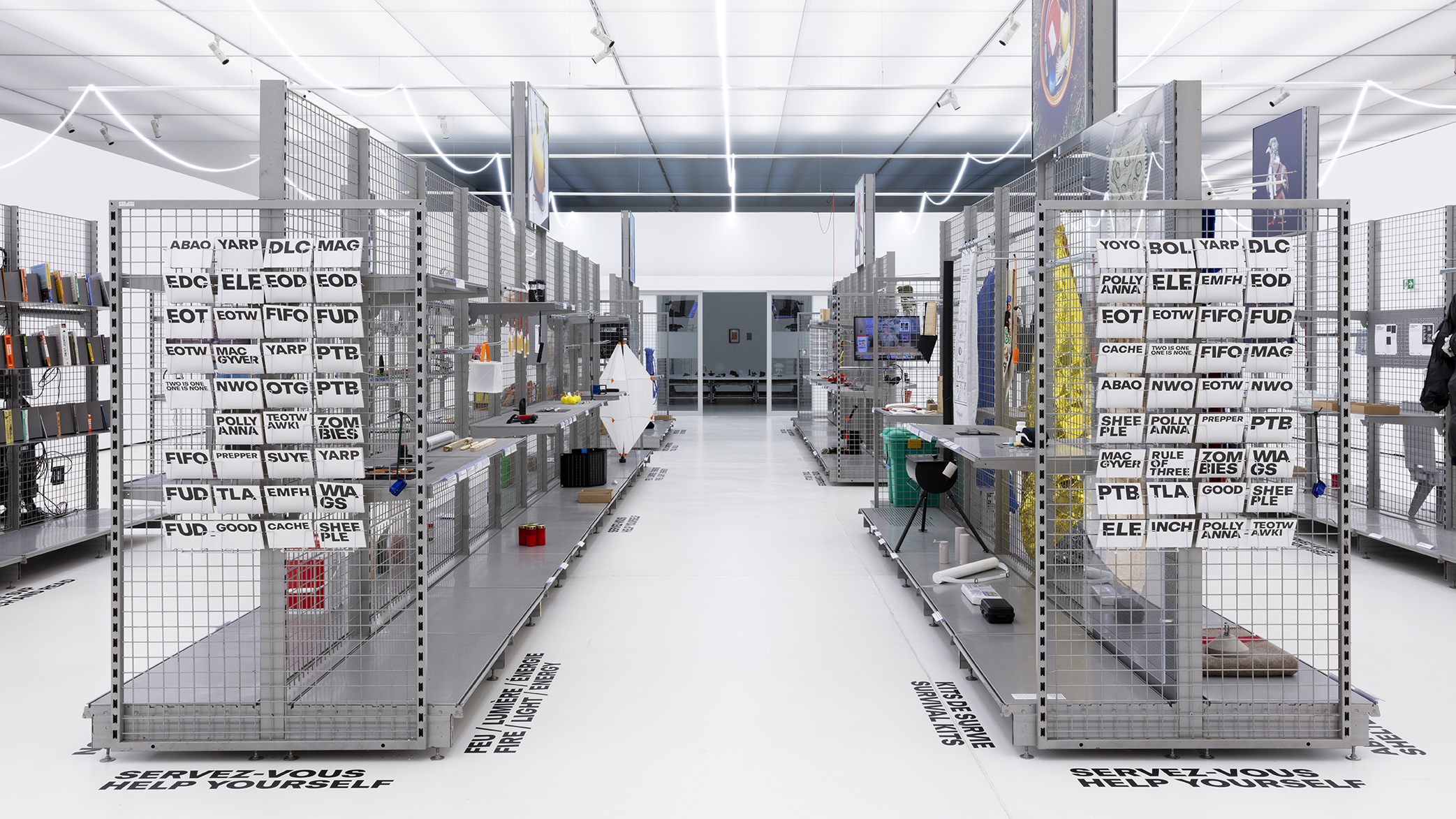 I ”The Prepper Supermarket”, kan besökaren botanisera bland produkter och lösningar för grundläggande överlevnadsbehov som vatten, mat, värme och skydd. Bild från när utställningen visades i Schweiz. Foto: Etienne Malpert, mudac